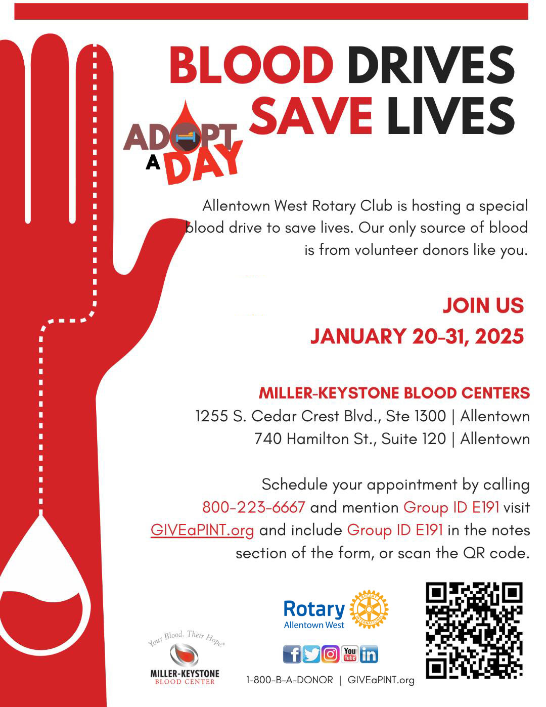 Allentown West Rotary is holding a blood drive from January 20-31 at Miller-Keystone Blood Centers. You can choose to go to 1255 S. Cedar Crest Blvd. or 740 Hamilton St. to make your donation. Platelets are also being gratefully accepted.